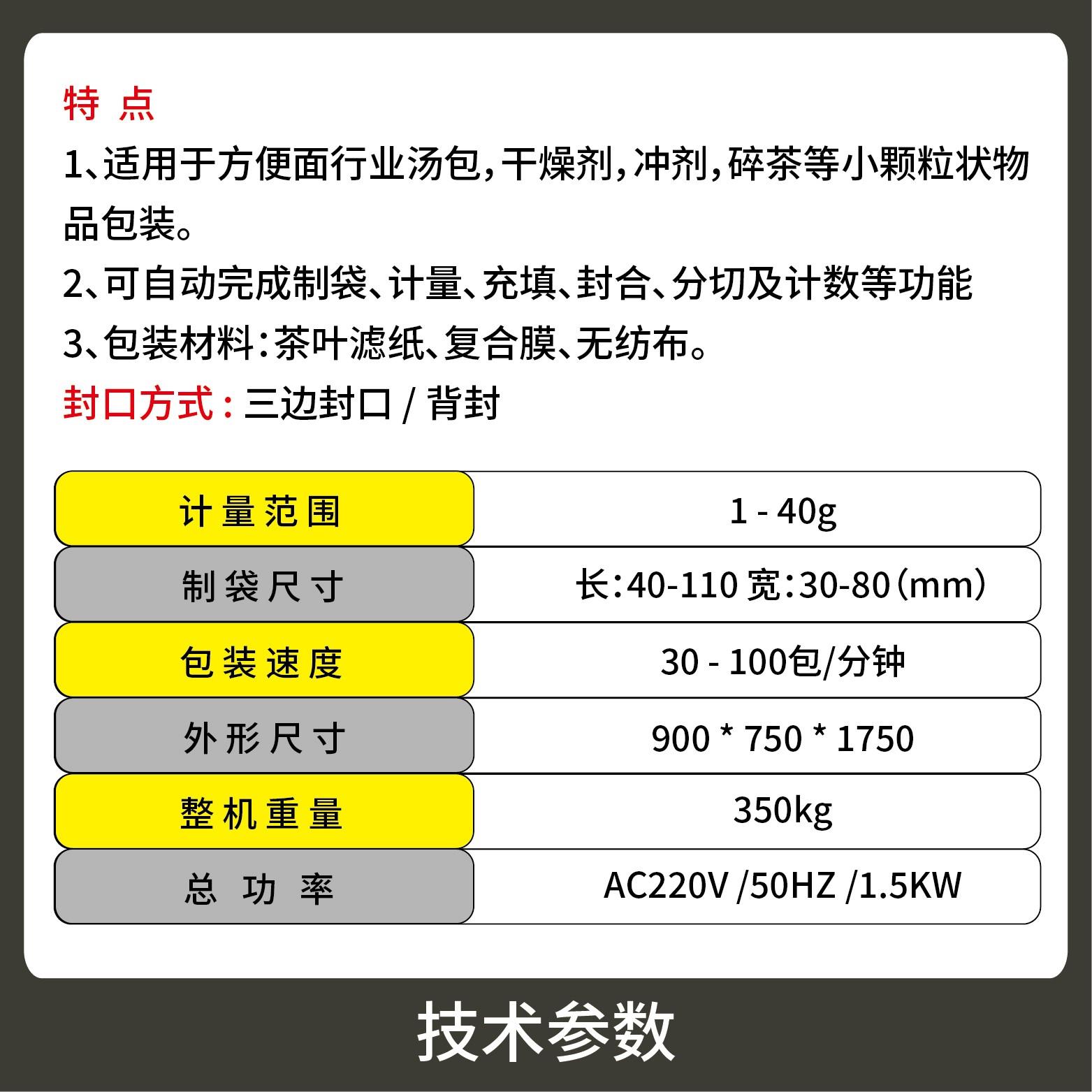 適用于方便面行業(yè)湯包,干燥劑,沖劑,碎茶等小顆粒狀物品包裝。